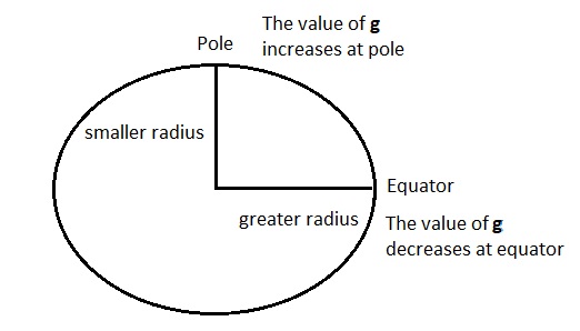The earth is not a perfect sphere. As the radius of the earth increases from the poles to the equator, the value of g becomes greater at the poles than at the equator.