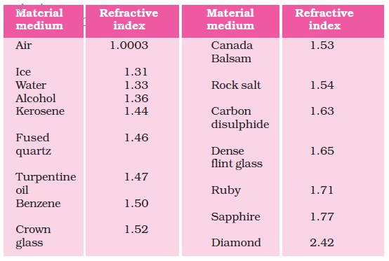 Example: The refractive index of diamond is 2.42, it means the ratio of speed of light in air and speed of light in diamond is 2.42. Diamond has higher refractive index and when the light will pass through it, the speed of light will be less. The material media of higher refractive index reduce the speed of light than normal and the material media of lower refractive index increase the speed of light when pass through it.