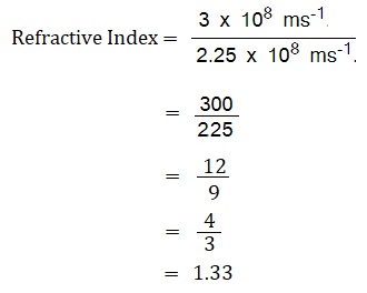 Example: The speed of light in air is 3 x 108 ms-1 and the speed of light in water is 2.25 x 108 ms-1. Find the refractive index of water with respect to air.