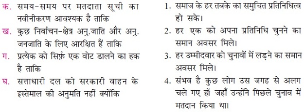 (घ) यह सत्य हैं, चुनाव सुधार के द्वारा धन बल और अपराधिक छवि वाले उम्मीदवारों को राजनीतिक से दूर करने की आवश्यकता हैं क्योंकि कई बार धन बल और अपराधिक छवि वाले लोग राजनीतिक दलों से टिकट पाने और चुनाव जीतने में सफल हो जाते हैं| ऐसे लोग जनकल्याण नहीं कर सकते बल्कि ये अपनी स्वार्थ सिद्ध में ही लगे रहते हैं|